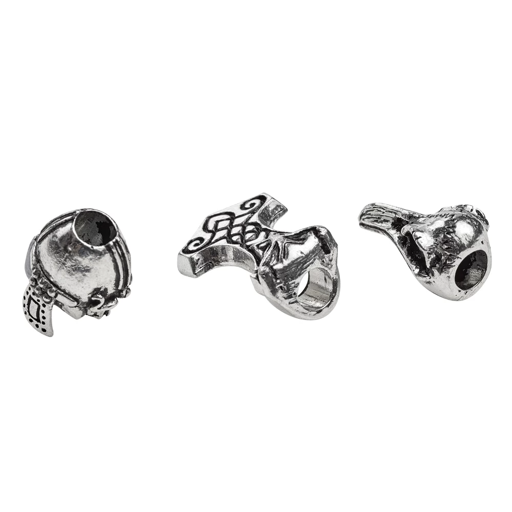 Un ensemble de trois perles dâĂ©tain Ă enfiler sur les cheveux ou la barbe: le marteau de Thor, le crĂąne du corbeau d’Odin et le casque du guerrier viking.