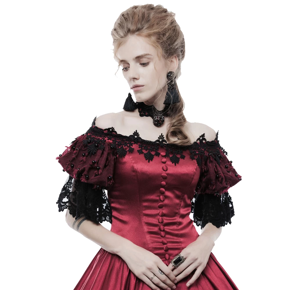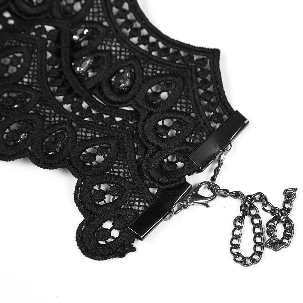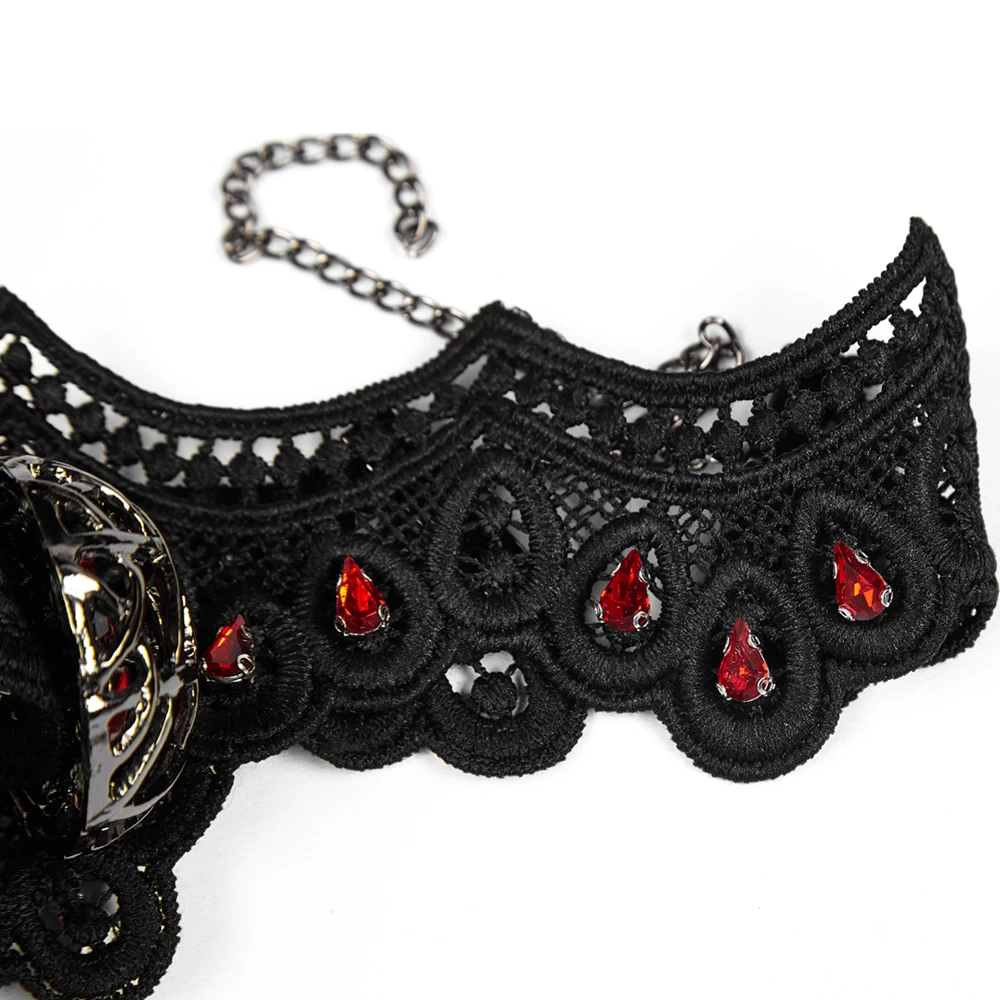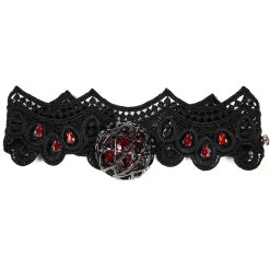 Ras du Cou en dentelle noire de style gothique victorien avec perles de cristal rouges et grand pendentif circulaire en cristal rouge recouvert de métal noir.