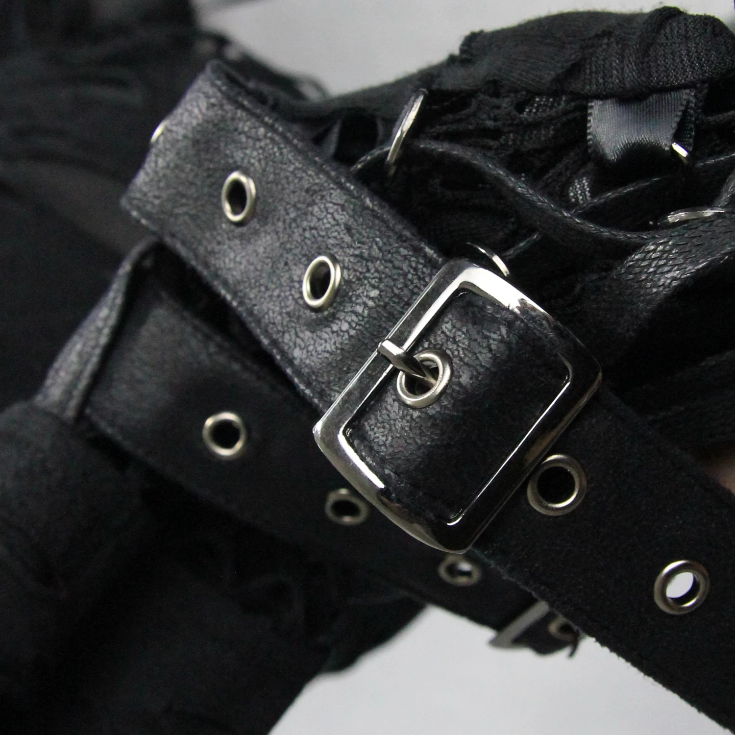 • Poignets troués se terminant en gants semi résille avec un laçage en simili cuir et 2 sangles à boucle