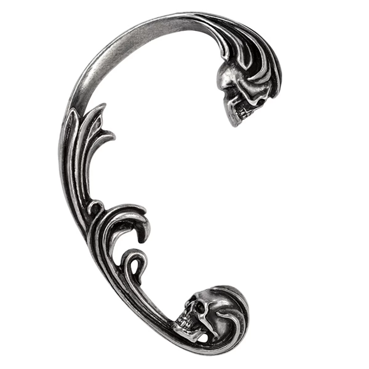 • Un bandeau d’oreille à couper le souffle (Ear Jewellery) fait à la main en étain vieilli et poli avec deux têtes de mort baroques.