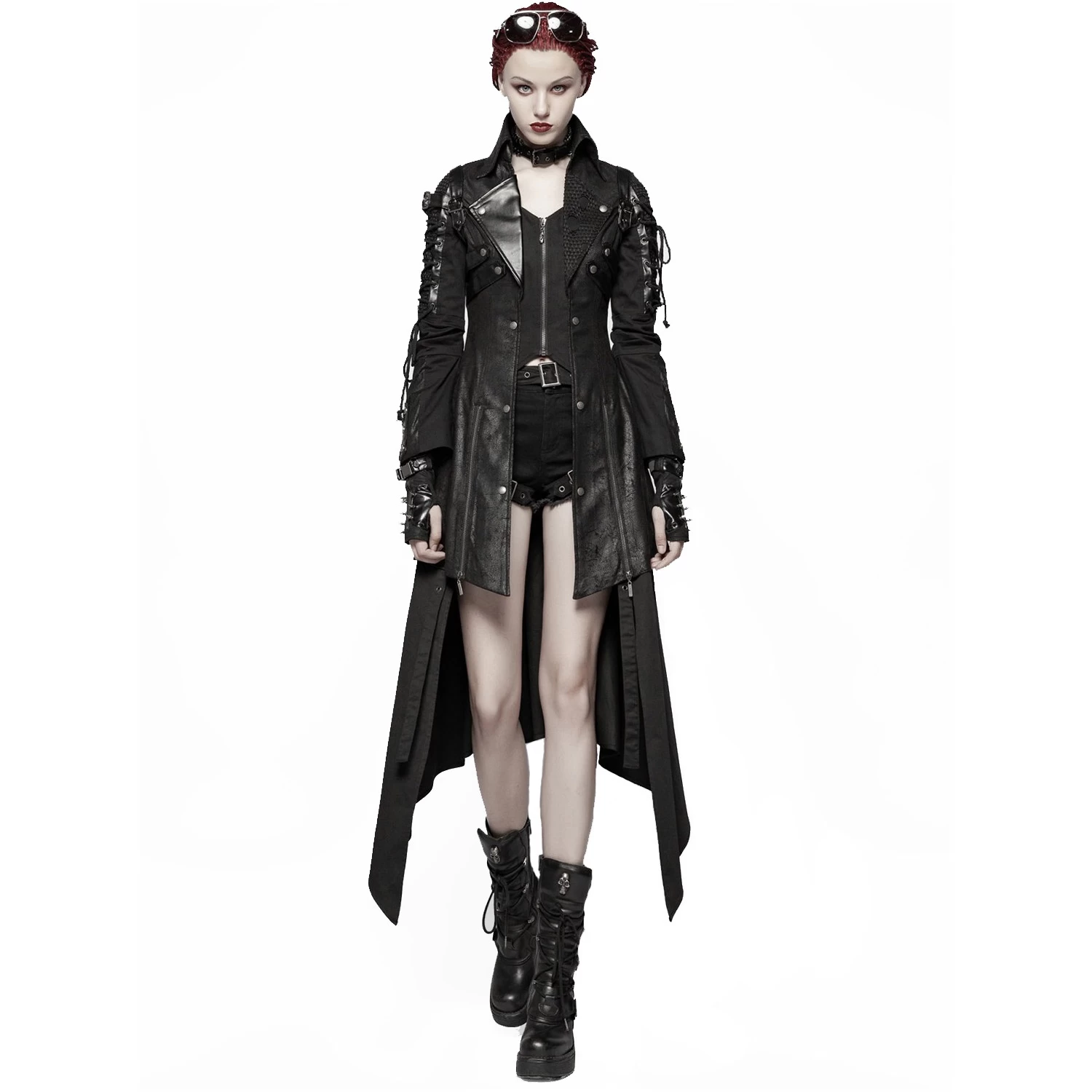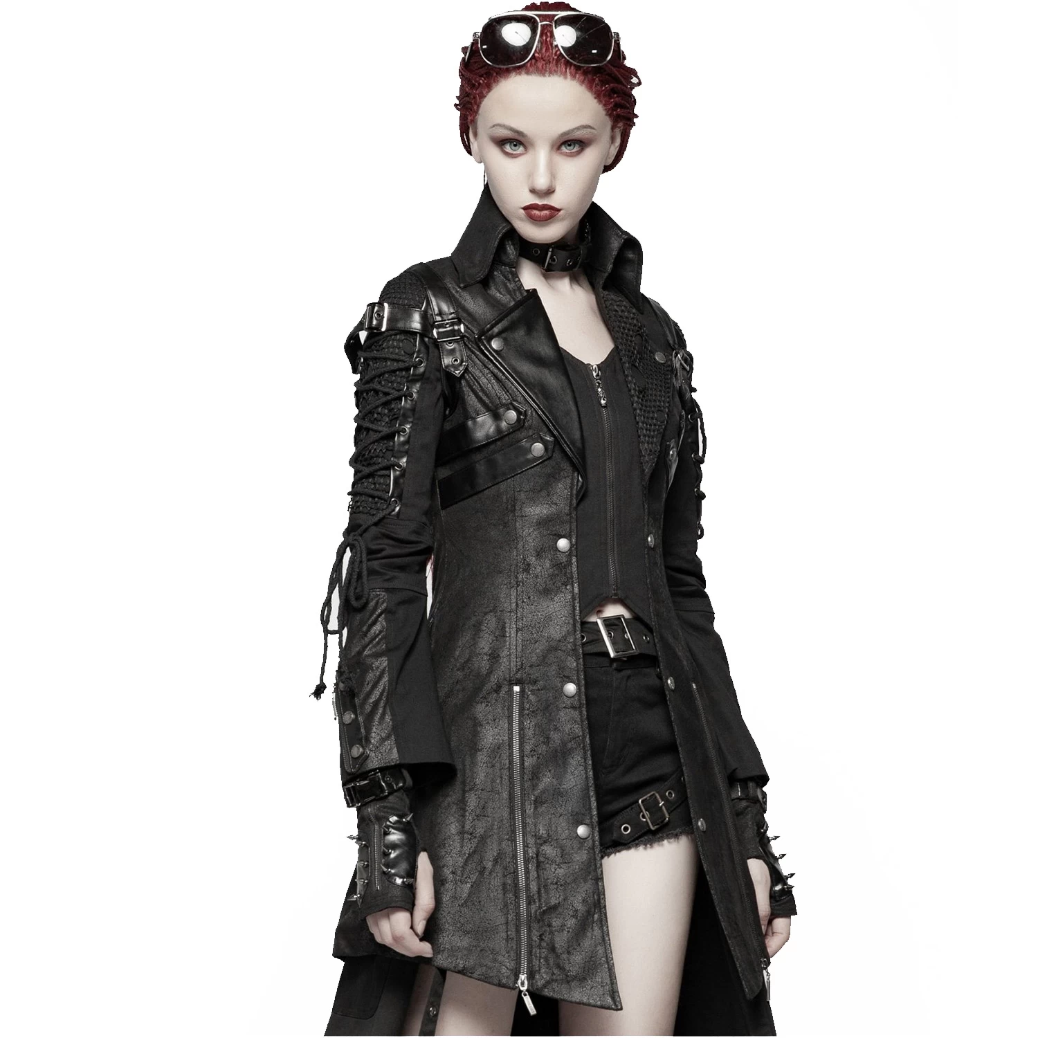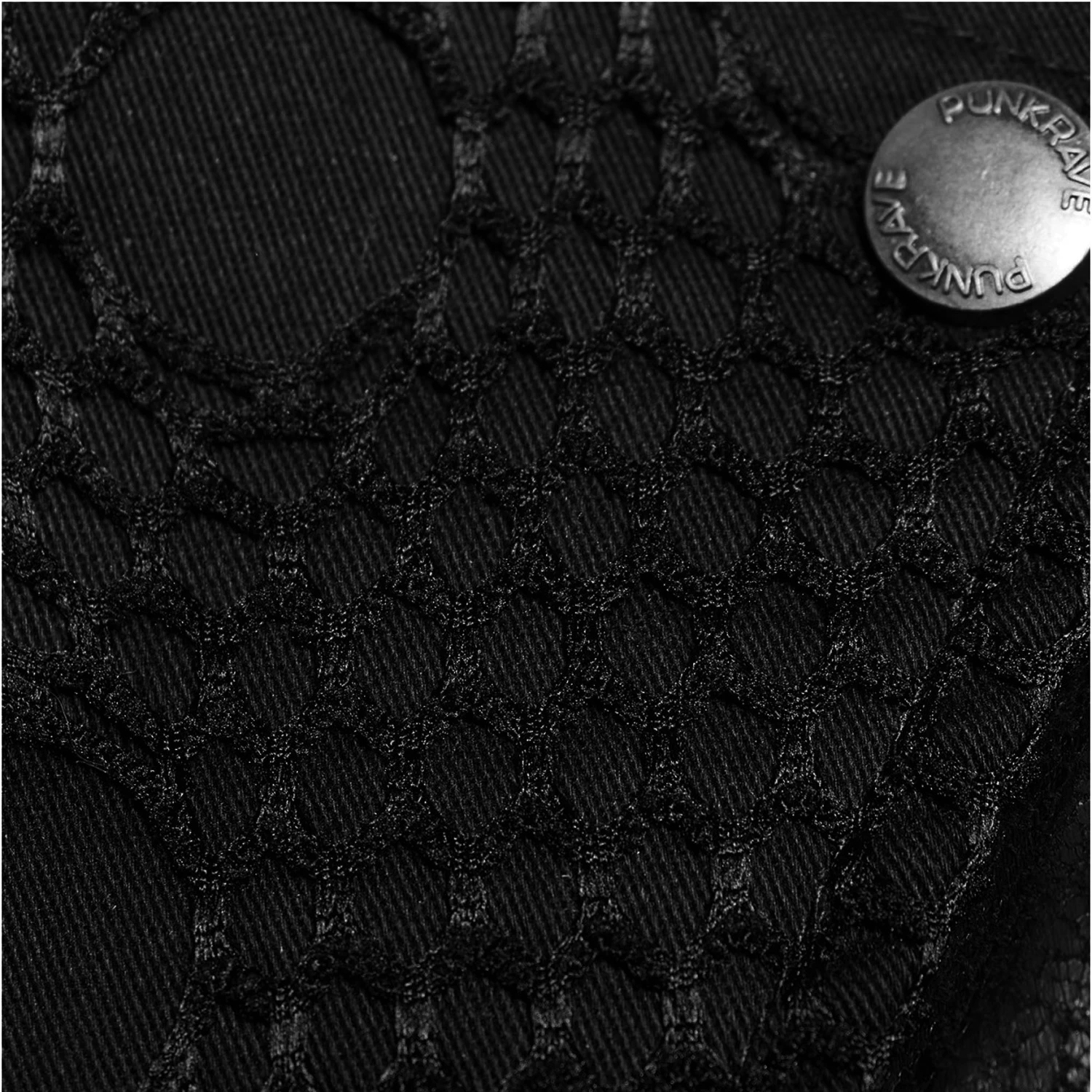 Veste noire gothique pour femme décorée de détails en cuir végétal synthétique, de tissu en résille, de fermetures à glissière et d’œillets à clous.