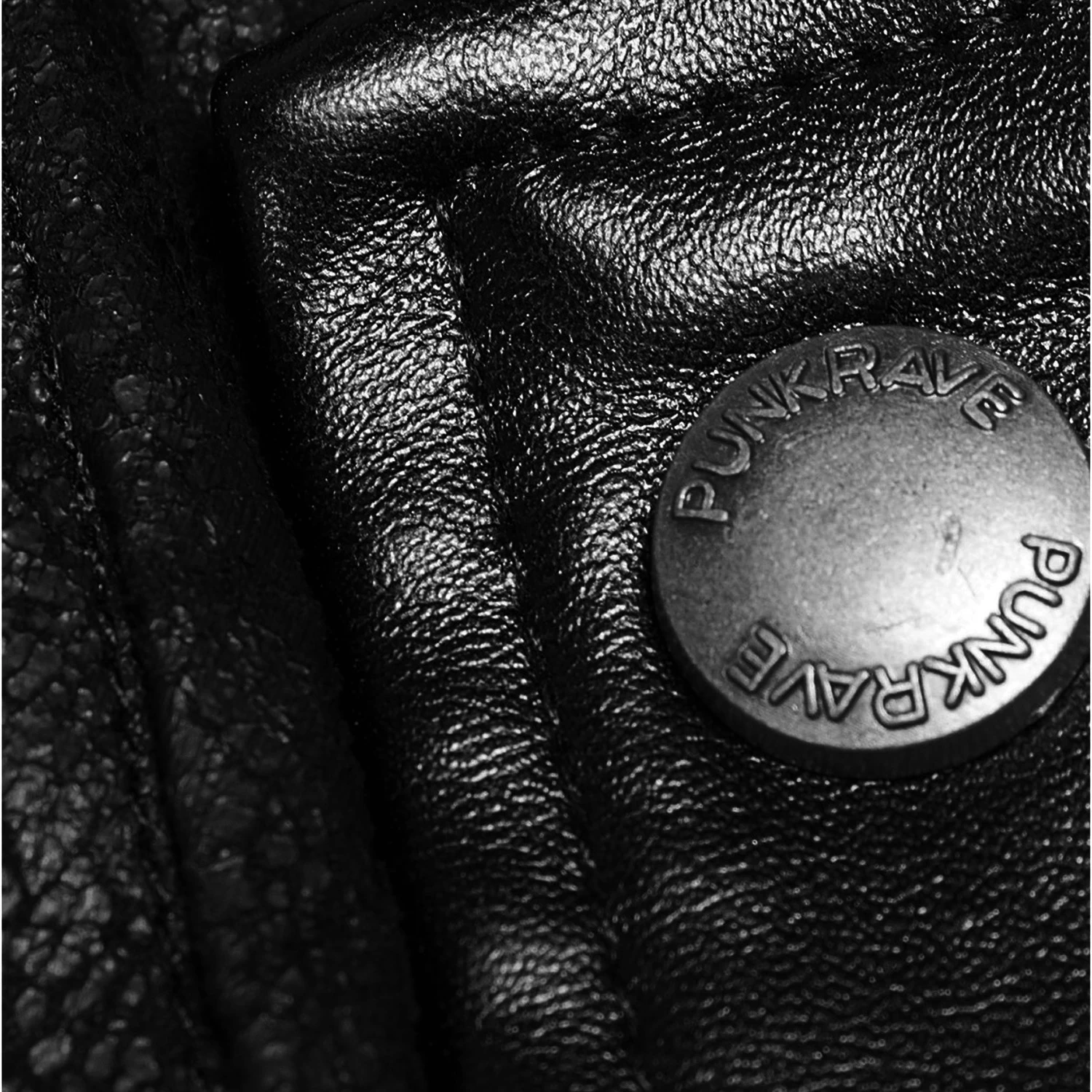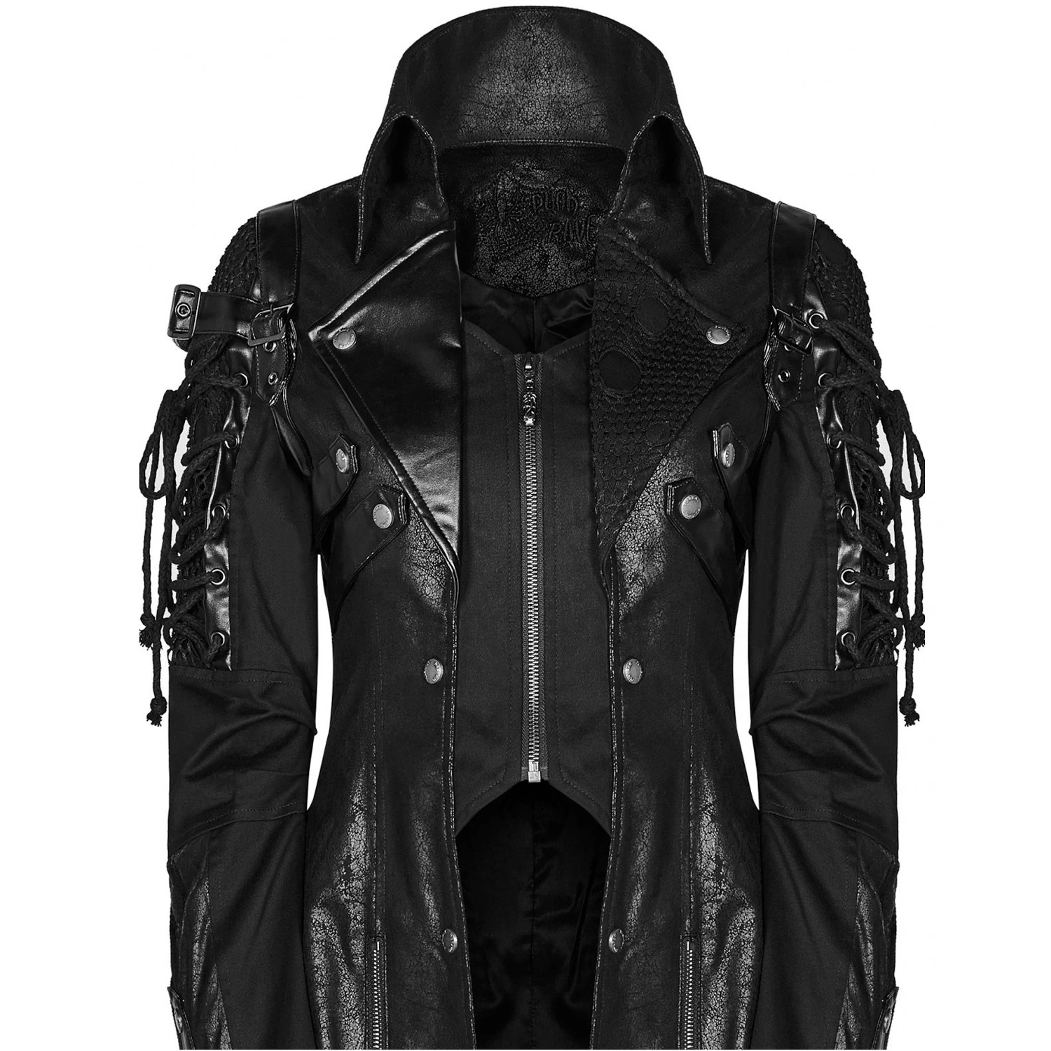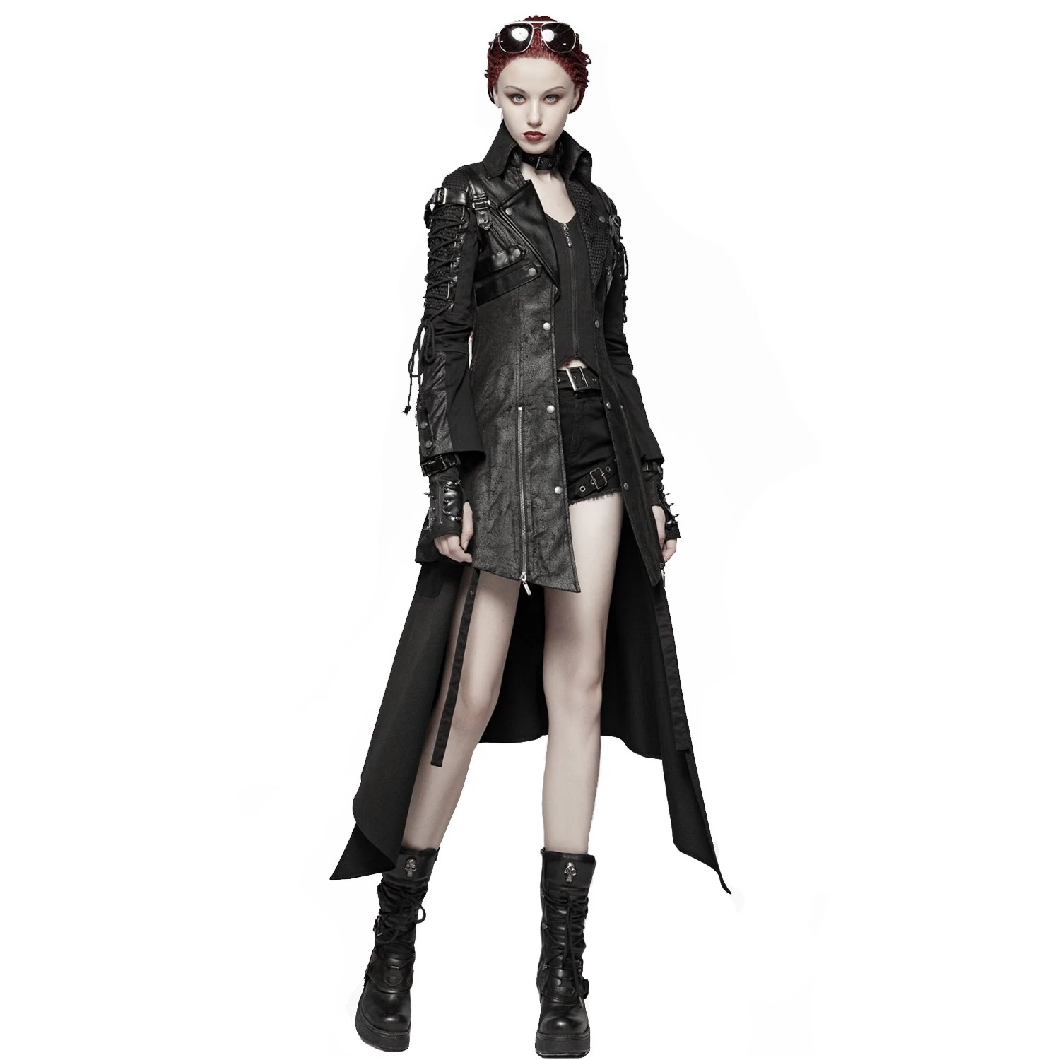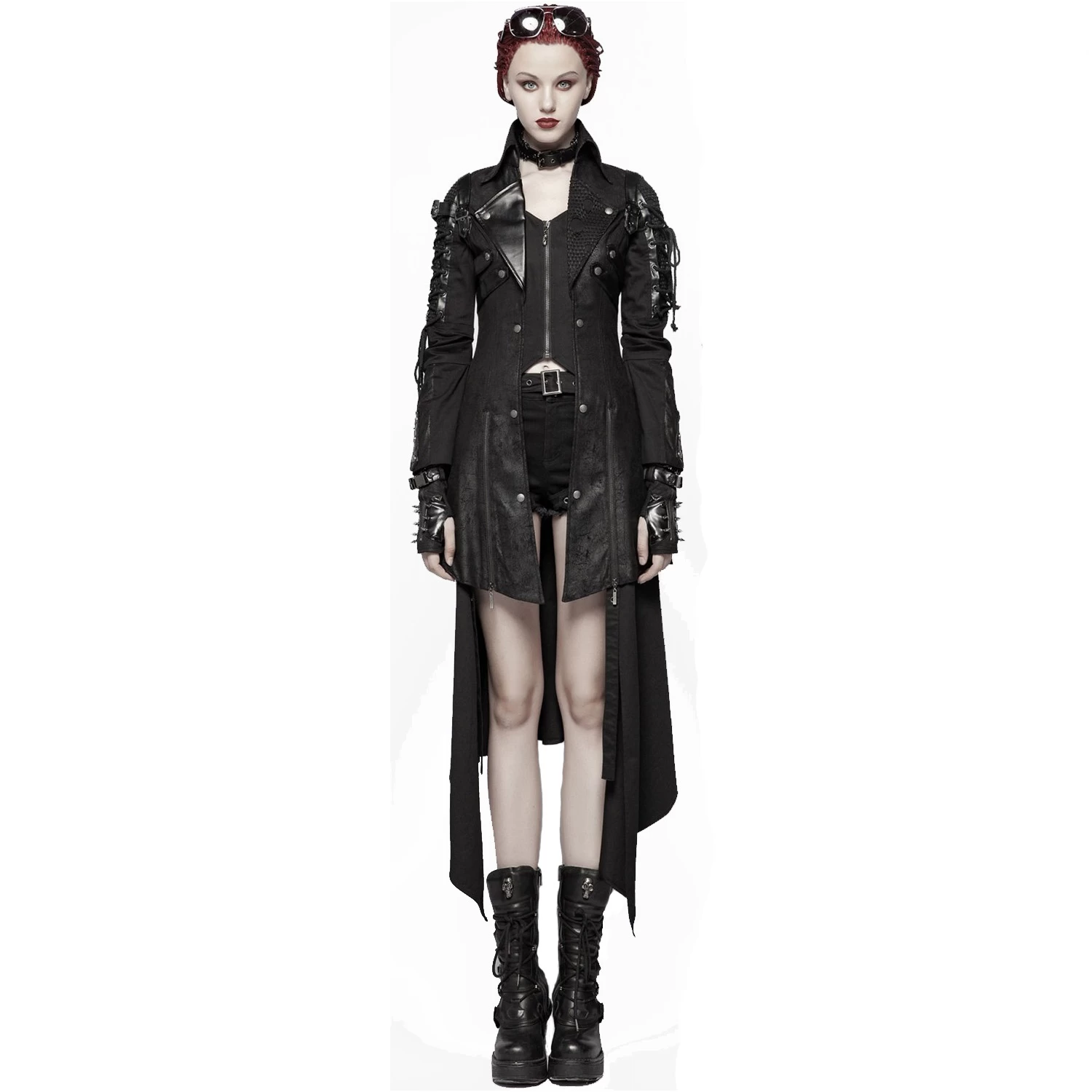 Veste noire gothique pour femme décorée de détails en cuir végétal synthétique, de tissu en résille, de fermetures à glissière et d’œillets à clous.